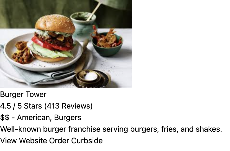 <p>$$ - American, Burgers</p>