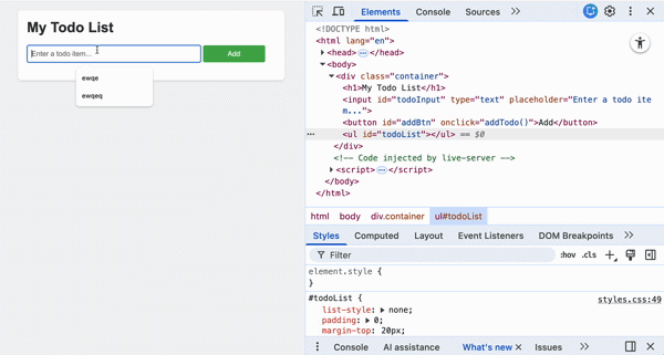 Now, preview index.html in the browser (using Live Server). You should see a simple form with an input field, a button, and an empty list below.