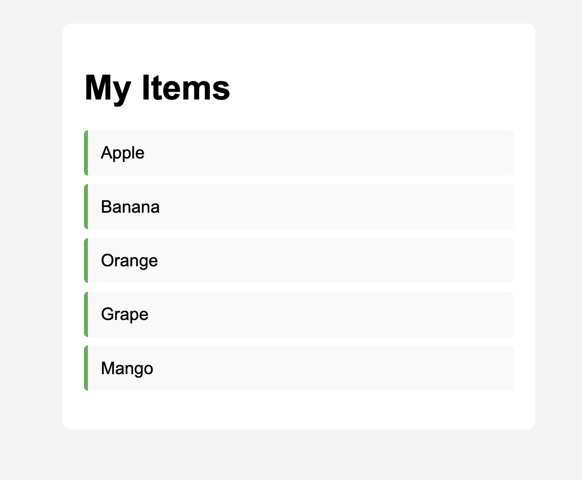 constarray calleditemswith at least 5 string values (e.g.,['Apple', 'Banana', 'Orange', 'Grape', 'Mango']). - Use