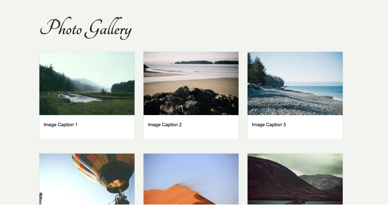 styles.css(then you will edit it in Part 3):@import url('https://fonts.googleapis.com/css2?family=Tangerine:wght@400;700&display=swap'); /* 3.1 Body */ /* 3.2 Header + nav */ /* 3.3 Custom font */ /* 3.4 Main */ /* 3.5 Gallery layout */ /* 3.6 Card styling */ /* 3.7 Footer */ /* 3.8 Media queries */