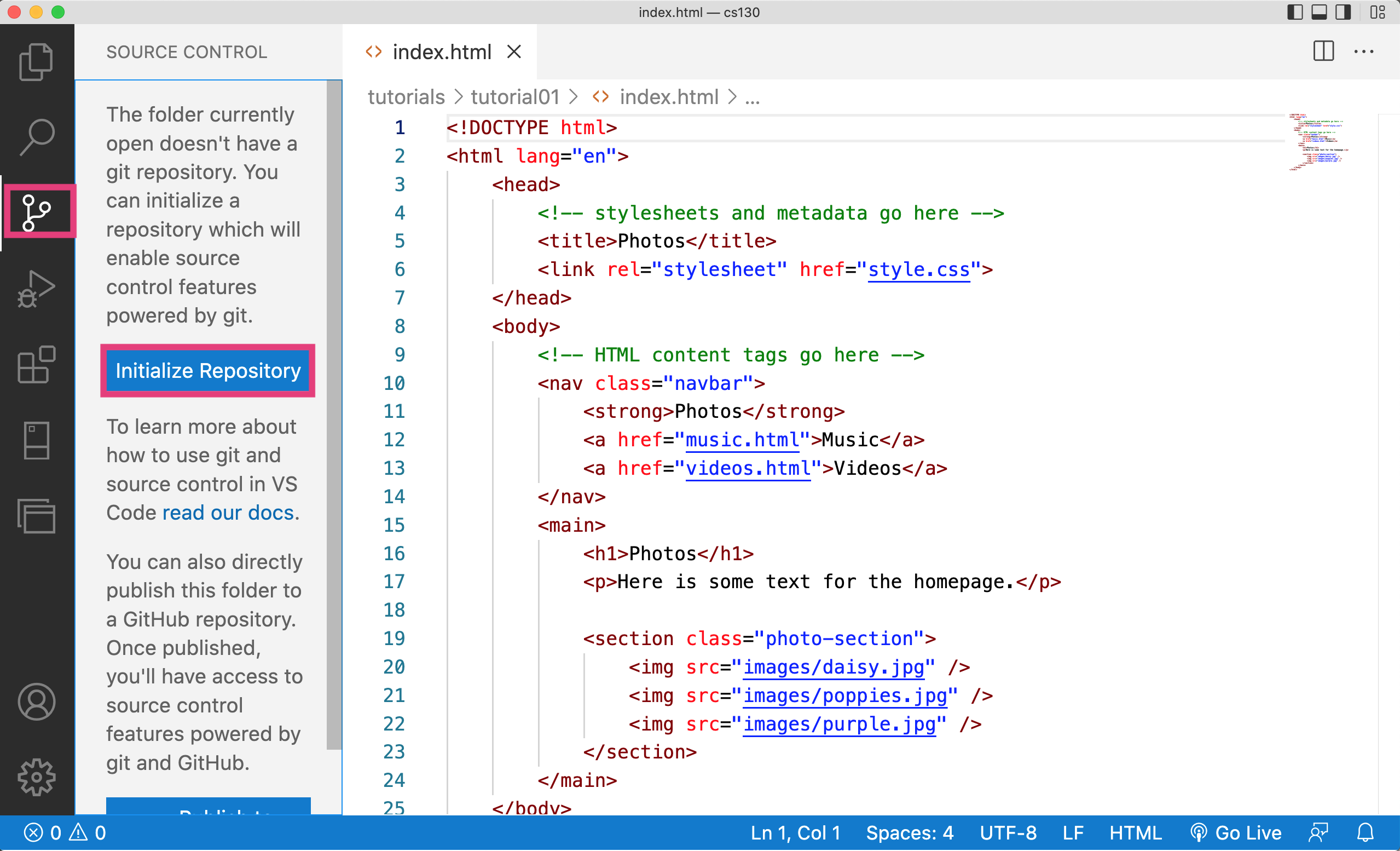 After you’ve doublechecked your file structure, open your entire csci344 folder in VS Code. Next, click on the icon that looks like a tree branch, and click the blue button that says “Initialize Repository”: