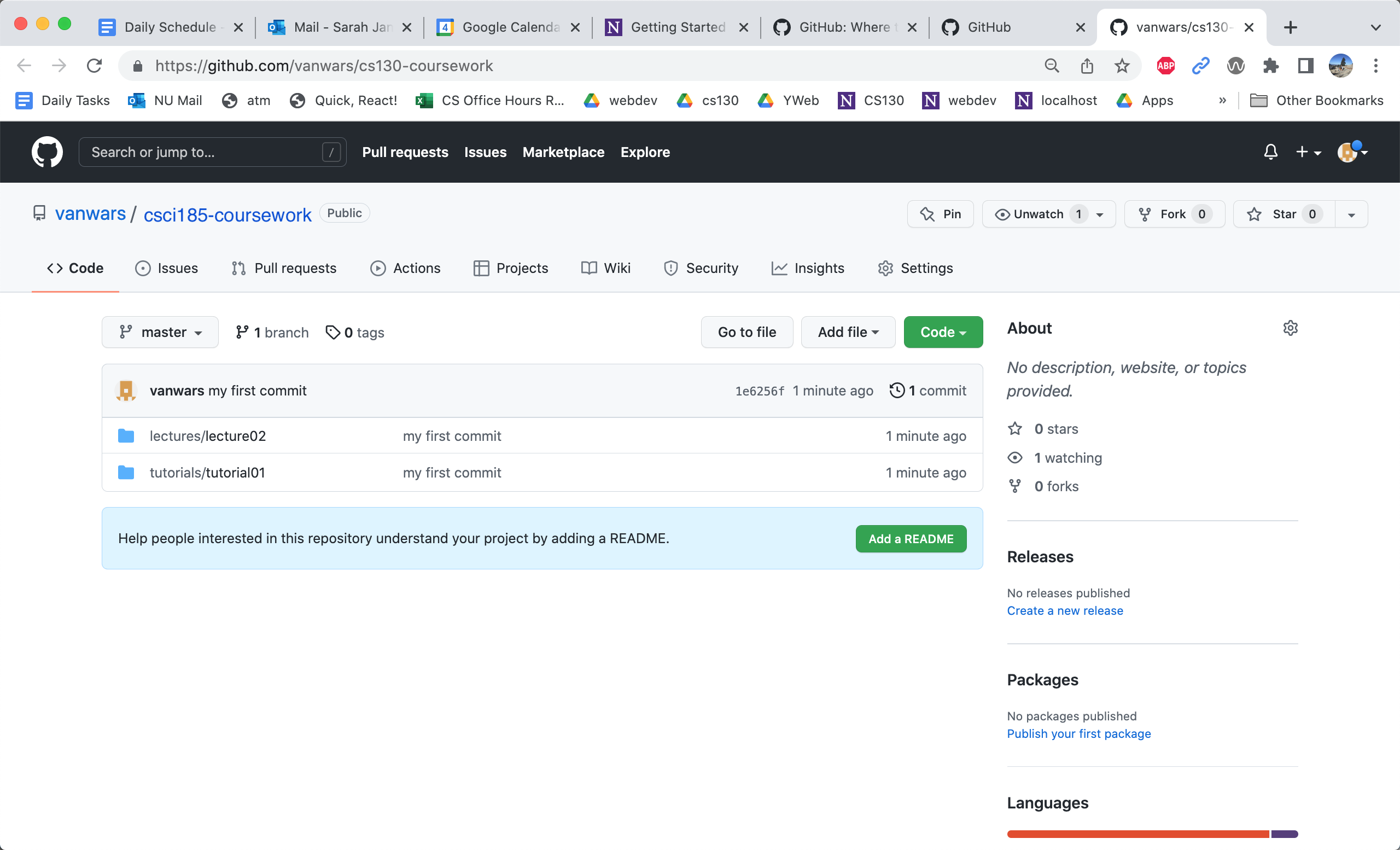 Clicking the button will open your newly created csci344-coursework repository and show you all of your files (which are now in the cloud):